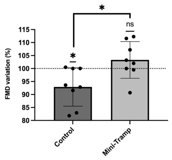 Effects of mini trampoline preconditioning compared to control on endothelial function as measured by FMD. Pre-dive values are taken as reference (100%). Data are expressed as means ± SD. (* = p < 0.05; ns = Not Significant).