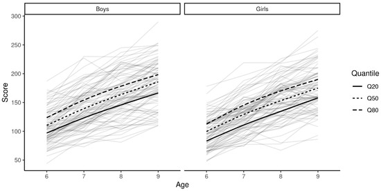 Figure 1 shows the three quantiles’ (Q20, Q50, and Q80) trajectories across age for both boys and girls embedded in intra-individual trajectories (spaghetti plot).