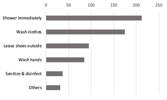 The results indicate that most respondents “shower immediately” and “wash clothes” when they go home after work to prevent potentially exposing their family to COVID-19 (Figure 1). To a lesser extent, many indicated that they “Leave shoes outside”, “Wash hands”, and “Sanitize and disinfect”.