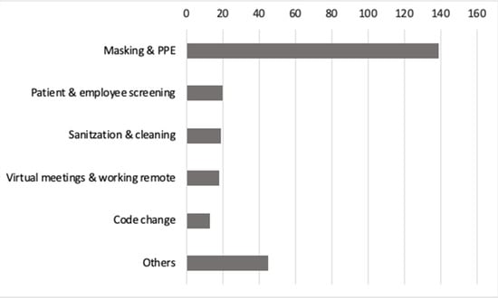Additionally, the majority of the responses to the open-ended question “Provide an example of a procedure implemented by the health system due to the COVID-19 pandemic that affected how you work” involved the additional precautionary measures put in place by the health system of requiring PPE and masking (Figure 2). Other examples included employee screening, sanitization, working virtually, and code change.