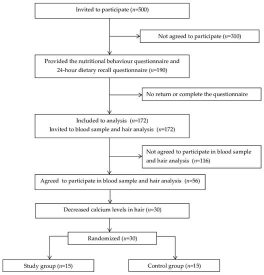 Subsequently, 30 children with low hair calcium (less than 300 mg/kg) were randomized into two groups of 15 children. The study group had an average of 181.55 ± 86.95 mg/kg of hair calcium, and the control group had an average of 164.43 ± 80.88 mg/kg. The age of the participants in the study group and control group was similar. The children from the study group were provided nutritional correction by modifying their diet with increased consumption of products containing calcium and vitamin D, calcium supplements at a dose of 500.0 mg, and vitamin D at a dose of 5.0 µg (200.0 IU) once a day for 3 months. For children in the control group, nutritional correction was performed only by a 3 month diet modification without added supplementation.