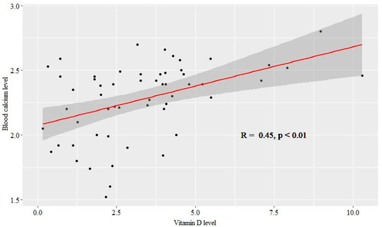 When comparing the dependence of calcium in the blood and nutrients consumed, high blood calcium was most often observed at high values of vitamin D (R = 0.45, p < 0.01) (Figure 2).