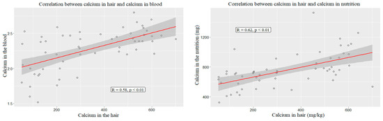 The absolute level of calcium in hair correlated with the indicators of calcium in blood and in nutrition. There was a positive, strong, reliable correlation with blood calcium (R = 0.58, p < 0.01) and a positive, strong, reliable correlation with the amount of daily calcium intake (R = 0.62, p < 0.01 (Figure 3)).