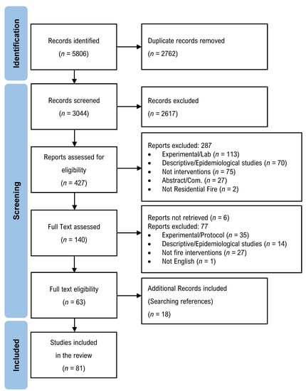 The search strategy was developed with the support of a health sciences librarian (CP). The following electronic databases were searched: MEDLINE, EMBASE, CENTRAL, Web of Science Core Collection, Trials Register of Promoting Health Interventions (TRoPHI), PAIS Index, Educational Resource Information Center (ERIC), FireDOC (National Institute of Standards and Technology), and IEEE Xplore Unpublished studies. Grey literature was searched using the following sources: Theses and dissertations (ProQuest Dissertations and Theses Global, The Networked Digital library of Theses and Dissertations—NDLTD), conference proceedings (Papers First and Proceedings via WorldCat FirstSearch), government reports (OpenGrey, Grey Literature Report), and Indigenous organizational websites (Training Programs in Epidemiology and Public Health Interventions Network—TEPHINET) (refer to Supplementary Materials for the search strategy). Relevant systematic reviews were included [,,,,] to add any studies identified through recursive searches of their reference lists. Furthermore, Google Scholar was used to review the citing references for all included studies and reports and any missed literature was added. Moreover, relevant fire safety materials included on Indigenous organization websites were searched for published and unpublished literature.