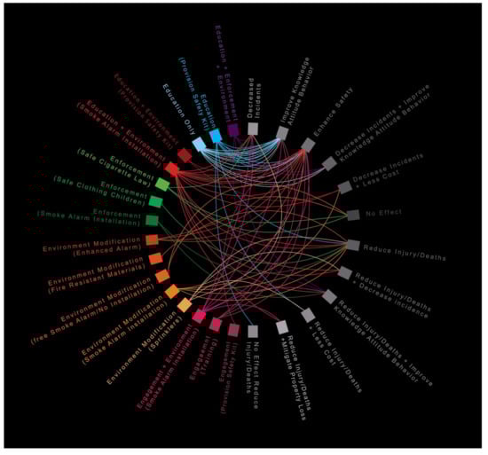 Education, Environmental Modifications, and Enforcement: Five previous reviews examined universal and distinctive resident-, property-, and fire-related risk factors associated with residential fires and thoroughly described effective interventions implemented in different countries [,,,,], including the UK, USA, Canada, Europe, and Japan (Figure 2). These reviews showed that households with young children, older adults, individuals with physical and mental disabilities, smokers and individuals with alcohol and drug addictions, single-family households, and low-income families were all at particularly heightened risk of fire-related injuries and deaths. Moreover, these reviews synthesized preventive strategies, methods, and best practices to prevent residential fires including environmental modification, promotion of safety regulations, and changes in risk behaviour among individuals. Proven best practices can be adopted as successful interventions to stimulate improvements in fire prevention practices in high-risk communities, with further adaptation to communities’ unique environmental, cultural, and social factors.