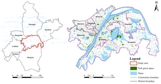 The study area and spatial distribution of park green space in Wuhan.