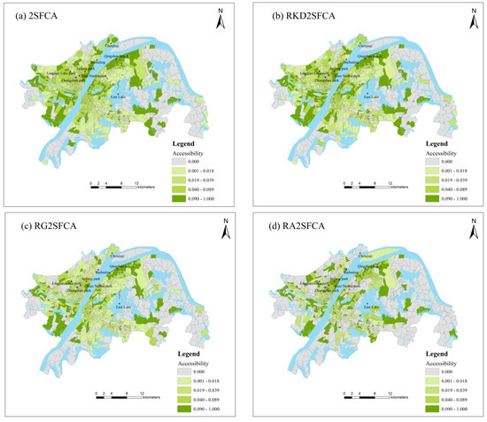 As shown in Figure 3, the accessibility of 1184 communities in the central urban districts of Wuhan are analysed based on the 2SFCA and its improved form. The park green space accessibility of community is divided into five levels by the Natural Breaks (Jenks), including lower, low, medium, high and higher. The spatial patterns of park green space accessibility calculated by the four methods are similar. RG2SFCA and RA2SFCA show a more notable gradient in the accessibility of park green space. Taking the northern part of Qingshan District as an example, the 2SFCA method reveals that there is high park green space accessibility here. In contrast, the RA2SFCA method suggests that it is mixed with medium and low park green space accessibility, which may be related to the smoothing effect of distance decay function in the supply–demand interaction.