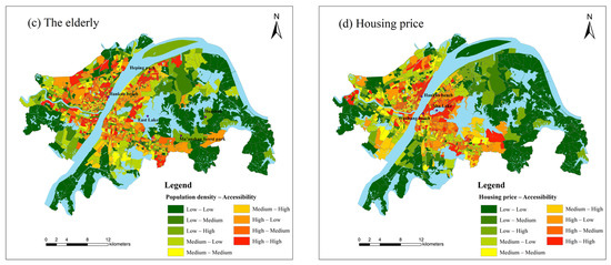 Residents’ demand for park green space will decrease with the increase of distance [54]. This supply–demand relationship shows a normal distribution with the change of distance, which is consistent with the performance of the Gaussian function [55]. Therefore, the RG2SFCA method is chosen to conduct the following research in this paper. We use the Natural Breaks (Jenks) to divide the accessibility, population density and housing prices into three levels: low, medium and high. Then the population density, housing prices and accessibility areas are overlapped respectively (Figure 5). For more visual display, we take the low-low, medium-medium and high-high levels as “matching”, and the rest as “non–matching” (Figure 6). As shown in Figure 5, the accessibility of park green space for youth and young and middle-aged people has similar distribution characteristics in a circle, with low accessibility in the outer circle. The matching degree of supply and demand in each circle layer is heterogeneous. The population density of the two groups matches the accessibility in the Jianghan Road Commercial District, the Yellow Crane Tower Scenic Area, and the north side community of Tangxun Lake. In the northwest of South Lake and East Lake, the Optics Valley Commercial District has a low degree of matching, which shows characteristics of “high population density–low accessibility”. There are more communities with dislocation of supply and demand, which means that the efficiency of park green space is inequitable. The region gathers colleges including Wuhan University of Technology and Wuhan University of Science and Technology, with a large number of young and middle–aged teachers and students, and is densely populated. As an important transportation hub and commercial center in Wuhan, the Optics Valley Commercial District is surrounded by many well-known universities and scientific research resources. The age structure tends to be young and middle–aged and the supporting park green space resources are few. The population density of the elderly in the Hankou Beach, Heping Park group and the west side of the East Lake have a higher matching degree with accessibility. Areas with low population density and high accessibility are occasionally distributed in the southeast of East Lake, Huashan Avenue and the south of Hanyang District. These areas have resources such as Ma’anshan Forest Park and Huashan Ecological Green City.