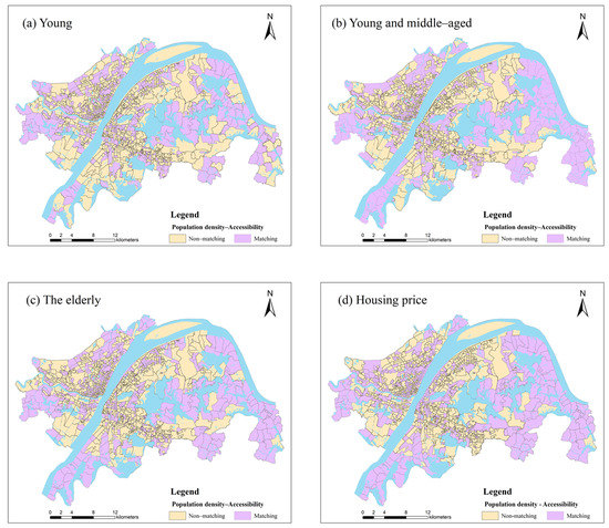 Spatial distribution of matching and non–matching between population density, housing price and park green space accessibility: (a) youth, (b) young and middle–aged, (c) the elderly and (d) housing price.