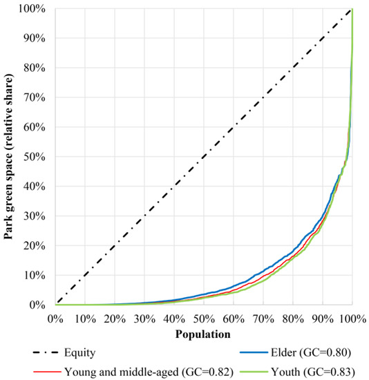 Lorenz curve and Gini coefficient of different age structure and park green space accessibility.
