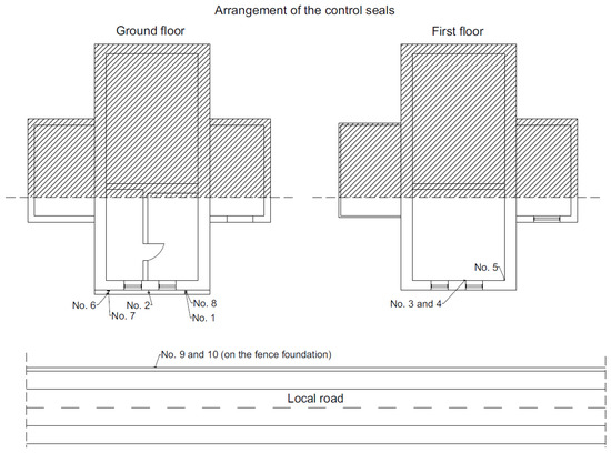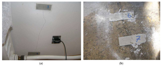 To determine the impact of road traffic on the analyzed building, a detailed analysis of the damage was carried out. Figure 2 presents the arrangement of gypsum control tapes on localized cracks in the walls of the building (No. 1–8) and on the fence foundation near the road (No. 9–10). The purpose of the control tapes was to determine the potential of damage propagation. The gypsum control tapes were 80 × 30 mm in size and 5 mm in thickness. The control tapes were protected with a transparent glass plate. The visible cracks were classified as medium length and the control tapes were glued symmetrically at the 1/3 and 2/3 of the height of the cracks. The condition of the control tapes was monitored once a week for two months. This period was sufficient because during this period (two summer months) the heaviest vehicles (41.2 tons) passed via the analyzed road due to the harvest in the nearby fields. In other periods of the year, regular passenger cars only travel this road. Figure 3 presents the gypsum control tapes placed on the wall of the building.