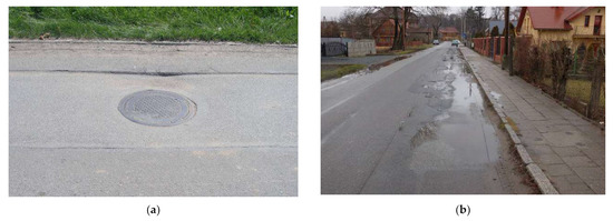 - The condition of the road pavement was classified at the warning level in accordance with [48] (class C—unsatisfactory condition). There were numerous voids in the road pavement, surface unevenness, damaged sewage manholes and contamination in the vicinity of the sidewalk.
