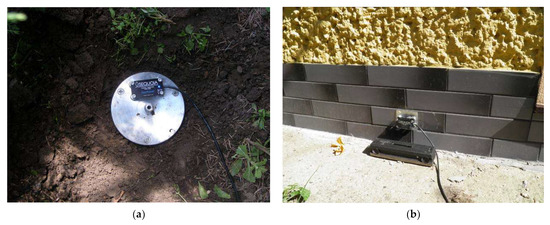 Figure 6. View on measuring points: (a) No. VII in soil, (b) No. I—situated on the outer wall of the building. - On the load-bearing wall at ground level (inside the building, from the side of the vibration source)—measuring points No. II and VIII;