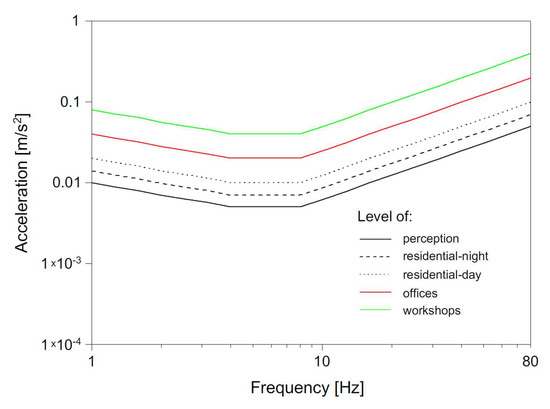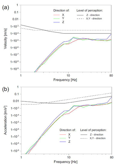 Vertical and horizontal vibration levels were of a very similar range; however, insignificantly higher maximum values were observed in the vertical direction for both acceleration and velocity observations in points localized on the ground (points No. III, V and VII). In points localized in the building (points No. I, II, IX and X) vertical and horizontal vibration levels were of a very similar range. Contravention of perception levels only in the vertical direction was additionally caused by lower perception levels for the vertical direction. The difference in perception level for the vertical and horizontal directions was the consequence of the fact that the human body is more likely to percept vertical rather than horizontal vibrations in frequency ranges between 4 and 80 Hz [46,51,52].