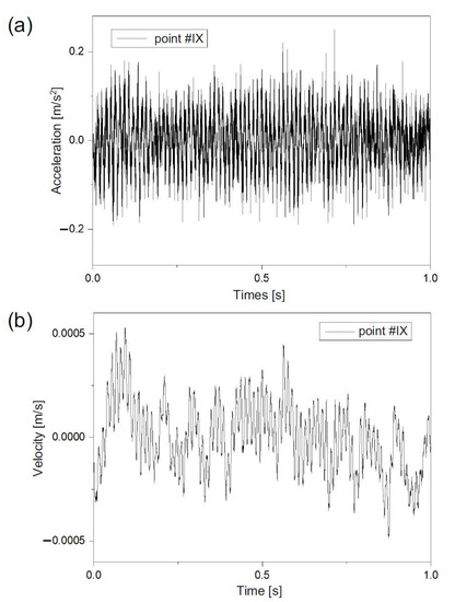 An extra measurement of vibration accelerations inside the analyzed building was carried out to set the harmfulness of vibrations associated with the traffic on the road for humans, according to [50]. The vibration velocities inside the building were calculated based on the integration of the accelerations received from the field tests.