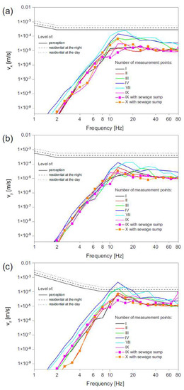 In the vertical direction, perception and annoyance levels were contravened for frequencies between 10 and 20 Hz in the case of measured points localized on the ground at a close distance to the road—points No. III, V and VII. The strongest contravention was observed at point No. V, at a frequency of 12.5 Hz (Figure 10c).