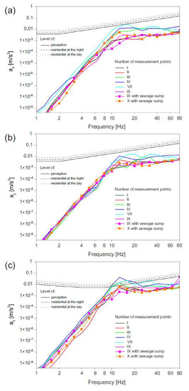 Observation of RMS acceleration indicates that there was no contravention of perception level for both horizontal directions for any of the analyzed passages (Figure 11a,b). In the vertical direction, perception levels and annoyance levels were contravened for frequencies between 10 and 20 Hz in the case of measured points localized on the ground at a close distance to the road—points No. III, V and VII (Figure 11c). Vibration levels at points No. I, II, IX and X, localized in the building on both the first and second floors were lower than perception levels in all three directions.