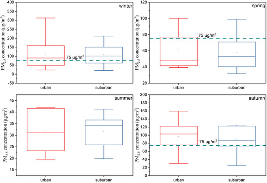 Figure 2 shows the PM2.5 mass concentrations in winter, spring, summer, and autumn during the sampling period at the urban and suburban sites in Zibo. The minimum, median, and maximum concentrations of urban PM2.5 were 20, 56, and 313 µg/m3, respectively, with 48.89% of the values exceeding the secondary standard of China’s air quality concentration limit (75 µg/m3, 24 h) [44]. The suburban minimum, median, and maximum concentrations of PM2.5 were 20, 65, and 212 µg/m3, respectively, with 42.22% of data representing concentrations > 75 µg/m3. Furthermore, 80% of the values at both sites exceeded the primary standard limit (35 µg/m3, 24 h), and 100% exceeded the WHO air quality guidelines for PM2.5 (15 µg/m3, 24 h) [44,45]. By comparing the statistics of the two sites, we can see that the median and maximum concentrations at the urban site were greater than those at the suburban site, especially the maximum values. Compared with sites in the North China Plain (NCP; northwest of Zibo), the proportion of polluted weather (PM2.5 > 75 µg/m3) at the urban (67%) and suburban (67%) sites during the winter sampling period were greater than that at the NCP sites (50%). However, the overall concentrations in summer were <75 µg/m3 at both the urban and suburban sites, whereas the NCP sites experienced haze pollution during their intensive summer observation period [46]. In other words, Zibo experienced greater winter pollution than the NCP but less summer pollution.