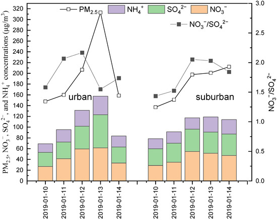 There was a typical haze episode from 10 to 14 January 2019 in Zibo according to the definition of haze episode [27]; Figure 3 gives the daily concentrations of PM2.5, SNA, and NO3−/SO42− during this episode. The average concentrations of PM2.5 were 197 µg/m3 and 180 µg/m3 at the urban and suburban sites, respectively, and the peak values were 312 and 212 µg/m3, respectively. Obviously, SNAs were the main components in PM2.5 during this episode, and the peak values of SNA/PM2.5 were over 60%. SNA components ranked in the order of NO3− > SO42− > NH4+, which was different from Beijing, where the SO42− ranked first [50]. In addition, NO3−/SO42− was above 1.0 and increased during the accumulation period. The above information demonstrates that NO3− played a predominant role in the formation of heavy haze, and mobile sources had a relatively important contribution.
