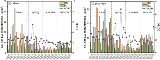 OC and EC are also major components of PM2.5, and their daily concentrations are shown in Figure 4. The annual concentrations of OC in PM2.5 in urban and suburban areas were 10.9 and 11.2 µg/m3, respectively, which are lower than those in other Chinese cities, e.g., 13.8 µg/m3 in Changzhou [51] and 14.4 µg/m3 in Wuhan [52], and are comparable to those measured in Guangzhou (9.4 µg/m3) [5]. The annual EC concentrations were 4.7 µg/m3 in urban and 5.1 µg/m3 in suburban areas, which are close to those of Changzhou (5.4 µg/m3) [51], Wuhan (5.2 µg/m3), and Guangzhou (6.2 µg/m3) [5]. Obvious similar seasonal variations in OC and EC were observed in both urban and suburban areas, with the highest average concentrations occurring in winter: 18.6 and 6.8 µg/m3 in urban and 19.1 and 8.2 µg/m3 in suburban areas, respectively. Moreover, the ratios of OC/PM2.5 were highest in winter, accounting for 19% and 20% of the PM2.5 in urban and suburban areas, respectively. The lowest concentrations of OC and EC were observed in summer.