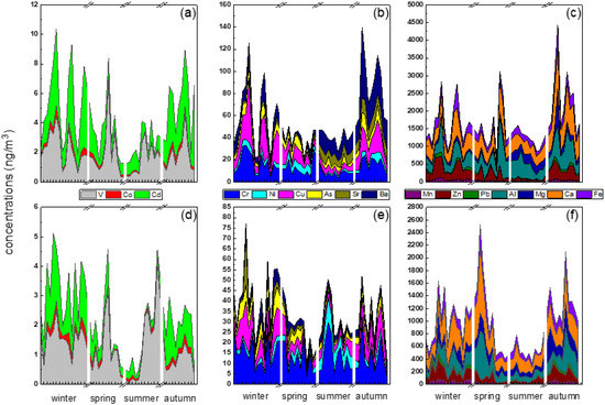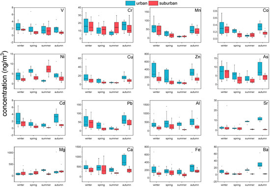 The seasonal average concentrations of various elements in PM2.5 are shown in Figure 5. The total elemental concentrations accounted for 1.96% and 1.33% of the mean PM2.5 concentrations at the urban and suburban site, respectively. In urban PM2.5 samples, Ca exhibited the highest levels (453.9), followed by Al (384.7), Zn (234.6), Fe (192.0), Mg (127.5), Mn (34.5), Pb (34.0), Ba (12.4), Cu (11.4), Cr (10.7), As (6.0), Ni (4.1), Sr (3.6), V (1.7), Cd (1.6), and Co (0.3; median values, ng/m3). Similarly, Ca exhibited the highest levels in the suburban PM2.5 samples (261.7), followed by Al (152.0), Fe (116.4), Zn (106.7), Mg (100.1), Mn (24.8), Pb (18.4), Cr (13.5), Cu (5.3), As (3.8), Ni (3.0), Ba (2.6), V (1.2), Sr (1.1), Cd (0.7), and Co (0.2; medians, ng/m3). The annual median concentrations of urban and suburban heavy metals Pb, Cd, and As were lower than the national ambient air quality standards limits of 500 ng/m3, 5 ng/m3, and 6 ng/m3, respectively. However, the Cr(VI) concentrations exceeded the limit of 0.025 ng/m3 [45]. Shandong province, where the Zibo is located, has the highest Cr emissions among all provinces in China due to its high capacity for steel production and coal consumption of industrial boilers [55].