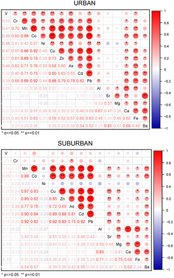 Pearson correlation of elements in urban (n = 45) and suburban (n = 45) samples.
