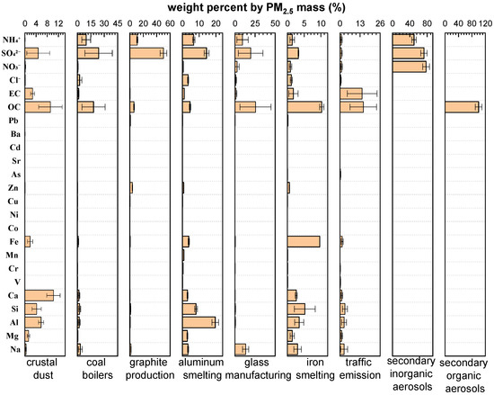 Chemical mass balance models for source apportionment require information about the chemical characteristics of the sources that are likely to affect pollutant concentrations at receptor sites [33]. The weight percentages of the PM2.5-bound chemical species in all sources (crustal dust, coal boilers, graphite production, aluminium smelting, glass manufacturing, iron smelting, traffic emissions, secondary inorganic aerosols, and secondary organic aerosols) are presented in Figure 8.
