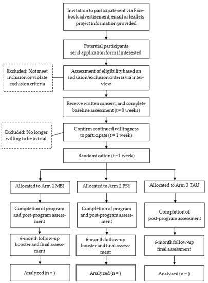 All analyses will be carried out according to the intent-to-treat approach and all participants who receive randomization and allocation to one of three treatment arms will be included for analyses []. Two-way ANOVA will be used to evaluate the effects of the MBI (Arm 1), relative to PSY (Arm 2) and TAU (Arm 3), and the analyses of the primary and secondary outcome measures will be analyzed by comparing the values at T0 and T1. In addition to the immediate program effects, outcomes measured at T1 and T2 will be compared, to assess whether maintenance effects will be sustained at 6-months.