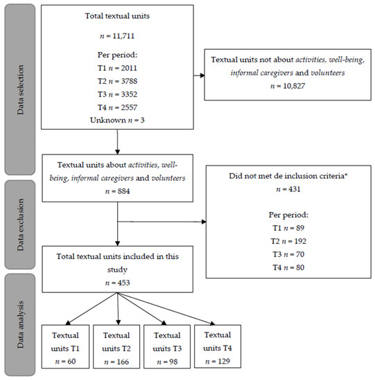 Flowchart of the included textual units per time period. Note: T1 is the first wave, T2 is the intermediate period, T3 is the second and third wave, and T4 is the vaccination period. * Exclusion criteria were: activities with a therapeutic aim, not in long-term care, concerning family caregivers and volunteers without mentioning activities, or were unclear.