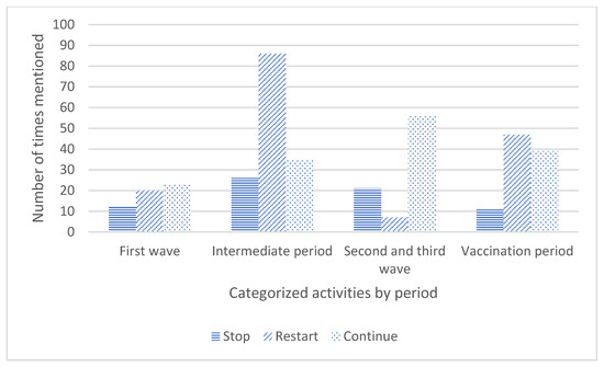 An overview of the frequency of the mentioned codes about activities per wave is given in Figure 2 and Appendix A. The most textual units were coded as restarted activities (n = 160), continued activities (n = 153), and stopped activities (n = 70). Some textual units included an activity whereof the start, stop, or continuation was unknown (n = 41). Moreover, 272 textual units were mentioned, and 85 contained considerations.