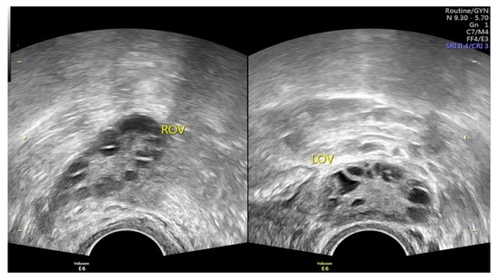 Polycystic ovary syndrome (PCOS) is the most common endocrine disorder among fertile females [1,2,3], affecting approximately 4 to 14% of reproductive-age females [1,2,3,4]. As a heterogeneous disorder of chronic anovulation, it is characterized by clinical or biochemical hyperandrogenism, ovarian dysfunction, and polycystic ovarian morphology (PCOM) according to the Rotterdam criteria [2,3,4,5,6,7,8]. Under pelvic ultrasound, PCOS is defined as the findings of multiple immature follicles and/or increased volume in bilateral ovaries [4,5] (Figure 1). More than just a reproductive syndrome, PCOS is currently viewed as a disorder with metabolic consequences which could affect women’s health during different stages of life [8]. This complicated reproductive and metabolic syndrome includes insulin resistance, menstrual irregularity, infertility, androgen excess, obesity, and a chronic low-grade inflammatory state [1,7]. It is also associated with other metabolic syndromes including dyslipidemia and increases the long-term risk of type 2 diabetes mellitus [2,9,10]. Insulin resistance is prevalent among PCOS patients, and as such the probability of type 2 diabetes is 5 to 8-fold compared with females without PCOS [10,11]. Type 2 diabetes and insulin resistance are often intertwined with PCOS; however, both of these co-morbidities seem not inevitable, and can be improved under good dietary or medical control.