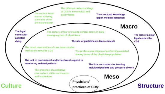 We aimed to explore physicians’ experiences and perceptions of environmental factors affecting CDS practice. Multiple environmental factors were identified that could be centered around culture and structure. Firstly, structural factors include (1) the lack of professional and/or technical support in monitoring sedated patients; (2) the use of guidelines in team contexts; (3) the time constraints for treating individual patients and pressure of work; (4) the structural knowledge gap in medical education; (5) the legal context for assisted dying; and (6) the lack of a clear legal context for CDS. Secondly, cultural factors include (1) the moral reservations of care teams and/or institutions towards CDS; (2) the presence of a palliative care culture within care teams and institutions; (3) the culture of fear of making clinical errors regarding CDS among a group of physicians; (4) the professional stigma of performing assisted dying among some of the physician population; (5) the different understandings of CDS in the medical and policy fields; and (6) the societal taboo around suffering at the end of life and natural death.
