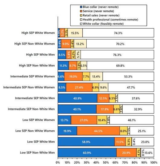 3.6. Working-Class Jobs and Never Remote Work by Socioeconomic Position, Gender, and Race/Ethnicity