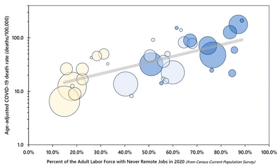 - Chen, Y.-H.; Glymour, M.; Riley, A.; Balmes, A.; Duchowny, K.; Harrison, R.; Matthay, E.; Bibbins-Domingo, K. Excess mortality associated with the COVID-19 pandemic among Californians 18–65 years of age, by occupational sector and occupation: March through October 2020. PLoS ONE 2021, 16, e0252454. [Google Scholar] [CrossRef] [PubMed]