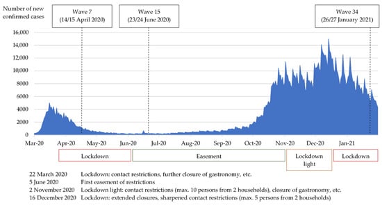 Development of daily incidences (n) of SARS-CoV-2 infections in Germany from March 2020 to February 2021. Important changes in pandemic measures for the public are marked. Own illustration based on incidence data from the dashboard of the Robert-Koch Institute https://experience.arcgis.com/experience/478220a4c454480e823b17327b2bf1d4/page/page_1/ (accessed on 28 June 2021).