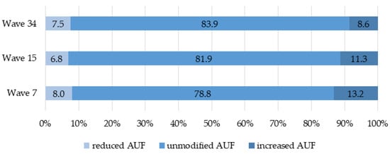 With 13.2% (W7), 11.3% (W15), and 8.6% (W34) of respondents, a decreasing trend across the different pandemic phases is indicated for an increased AUF (see Figure 2). The univariate logistic analysis (see Table S1 in the Supplementary file) showed a significant difference for results between W34 vs. W7 (0.62; 95% CI: 0.47–0.82) and W34 vs. W15 (0.74 [0.55–0.99]). The proportion of subjects with reduced AUF was 8.0% (W7), 6.8% (W15), and 7.5% (W34).