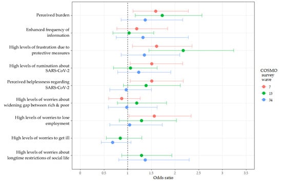 For our analyses, the items were recoded into binary variables describing high levels of worries with response formats of “yes” (5–7) and “no” (1–4). Similarly, the variables assessing the frequency of obtaining information about SARS-CoV-2 (1: never, 7: very often) and frustration due to pandemic measures (1: not at all, 7: very much) were converted to analyse increased information seeking and frustration, respectively (5–7: yes, 1–4: no). Furthermore, two 7-point Likert scale variables about SARS-CoV-2 perception (i.e., the SARS-CoV-2 is something) were conducted by COSMO: One with “I feel helpless about” (1) to “I can actively do something about” (7) and another with “I think a lot about” (1) to “I almost never think about” (7) as response options. For our study, these items were recoded to perceived helplessness regarding SARS-CoV-2 (1–3: yes, 4–7: no) and high levels of rumination about SARS-CoV-2 (1–3: yes, 4–7: no).
