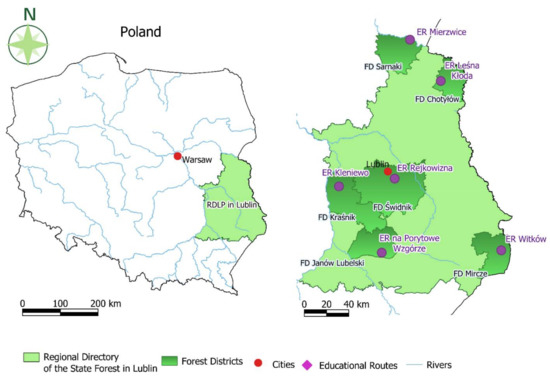 The study was carried out in the Regional Directorate of State Forests in Lublin (RDSF), which consists of 25 forest districts. The RDSF manages an area of 426 thousand ha, including 408.4 thousand ha of forest land. The forest cover in the region is 24.9%, which is one of the lowest in the country. Six educational paths located in the following Forest Districts were selected for the experiment: Chotyłów, Mircze, Sarnaki, Świdnik, Janów, and Kraśnik (Scheme 1).
