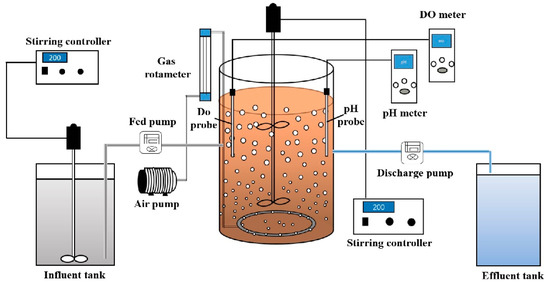 Domestic sewage was sampled from a sewer every day in the time period of 16:00–17:00. The sewage was collected from the second campus of the Harbin Institute of Technology and the residential quarters near the campus. A total of 40 L sampled sewage was passed through a 40 mesh sieve and stored in a 60 L influent tank. The main characteristics of the sewage sample are shown in Table 1. Two SBR reactors with a working volume of 9 L were set up in this study. The schematic diagram is shown in Figure 1. Two anaerobic SBR (AnSBR) were also set up to investigate the methanogen efficiency of WAS from the aforementioned SBRs. The working volume of the two AnSBRs were both 2 L.