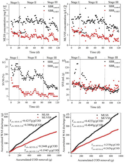 The operational stability was assessed by the measurements of MLSS, MLVSS, SVI, and Yobs as shown in Figure 2. The average MLSS, MLVSS, SVI, MLVSS/MLSS, and the p-value (t-test) of the two SBRs during each stage are shown in Table S1. The average concentrations of MLSS in SBRS-SRT decreased with the decrease in SRT, as shown in Figure 2a. The average ratios of MLVSS/MLSS decreased from 60.2 ± 6.1% to 54.0 ± 8.0% with the SRT shortening from 4 d to 3 d in SBRS-SRT, which was not consistent with the study in [15]. As shown in Table S1, the average MLVSS/MLSS ratios of SBRS-SRT remain slightly higher than SBRcontrol (54.0 ± 8.0% vs. 51.2 ± 6.3%, p = 0.10). This phenomenon might be caused by the difference and instability of sewage quality. However, a higher MLVSS/MLSS was beneficial to the sequential AD treatment of WAS [18].
