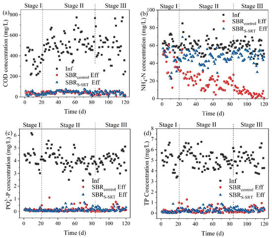 Performances of the two experimental SBRs on (a) COD, (b) -N, (c) -P, and (d) TP removal.