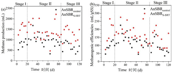 The methane production and methanogenic efficiency of two AnSBRs (AnSBRcontrol and AnSBRS-SRT) treated WAS from the corresponding two SBR is demonstrated in Figure 4. The methanogenic efficiency of the AnSBRS-SRT treated WAS was significantly higher than the AnSBRcontrol. The WAS average methanogenic efficiency decreased from 166.7 ± 54.7 mL CH4/gSS to 136.0 ± 53.2 mL CH4/gSS when the SRT of SBRS-SRT shortened from 4 d to 3 d. This result was consistent with the decrease in MLVSS/MLSS ratios (from 60.2% to 54.0%), as previously discussed. However, the average methanogenic efficiency of the WAS collected from the SBRS-SRT (SRT 3 d) was 54.1% higher than the methanogenic efficiency of the WAS collected from the SBRcontrol (the oxic phase duration as 2.5 h), as shown in Table S5. As discussed above, the two SBRS achieved equivalent COD removal efficiency. Taking the increase in Yobs and comparable COD removal efficiency into an account, the methane recovery potential of SBRS-SRT at SRT 3 d was 95.1% higher than the SBRcontrol with the oxic phase duration as 2.5 h, according to Equations (2) and (3). The S-SRT approach was an effective and promising selection for the enhancement of energy recovery.