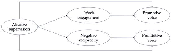 Currently, scholars usually use psychological ownership theory [30], the role of cognition theory [31], organizational identity theory [32] and other theoretical perspectives to explain employee voice behavior. Voice behavior is usually considered an extra-role behavior with constructive intentions [24,33,34]. However, from the perspective of maintaining personal interests, employees may also use voice behavior as an instrumental means of balancing resources [24,27,35,36]. Based on the conservation of resources theory, when employees suffer from the psychological and work stress caused by abusive supervision [37], they tend to avoid further personal losses to balance their resources. Therefore, they will reduce their work engagement accordingly and will not proactively engage in promotive voice. Meanwhile, unlike promotive voice, which requires more creative ideas and resources to make the organization better in the future, prohibitive voice is less influenced by work engagement and consumes fewer cognitive resources. It is a kind of voice behavior to stop and solve serious problems in the organization at present. It is more likely to be influenced by psychological safety and emotional factors. According to social exchange theory [38,39], when employees are subjected to abusive supervision, they will be affected by negative reciprocity beliefs and will feed this bad treatment back to the organization to varying degrees [40]. When employees are defensive and retaliatory due to negative reciprocity beliefs caused by abusive supervision [40], they will reduce prohibitive voice behavior when the organization has problems. Promotive voice is less affected by negative reciprocity for the following reasons. Negative reciprocity is a sense of revenge that makes employees hope that their organizations get worse. When problems occur in the organization, they choose to remain silent and not address the problems, which can have an immediate and serious negative impact on the organization, leaving it devastated. However, promotive voice is only concerned with the better development of organizations in the future and will not be a critical threat to the organization’s survival and development at present. Without promotive voice, the organizations just remain as usual. Such a kind of voice behavior does not achieve the employees’ purpose of retaliating against the organization. Therefore, to further discuss how abusive supervision influences employee voice behavior, our study uses conservation of resources theory [41] and social exchange theory as a framework to combine work engagement [42,43] and negative reciprocity [44] as separate mediating mechanisms for each of the two types of voice behavior to further explore the relationship between abusive supervision and employee voice behavior.
