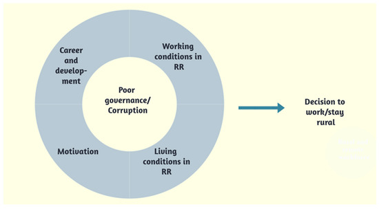 Five superordinate themes emerged as the interpretation of the descriptive experiences of the participants: poor governance, working conditions in RR areas, career and professional development, living conditions in RR areas and motivations to work in RR areas. Corruption was identified as an overarching theme as it was referred to in all of the derived themes (Figure 1). Facilitators and barriers to working in RR were identified across the emergent themes and contributed to participants’ decision-making with respect to working rurally (Figure 1).