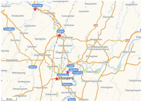 The sample collection took place between July–September 2020, as this was the high-water season of the Jialing River. To analyze the characteristics of microbial colonies in the Chongqing area of the Jialing River, four sampling points (as shown in Figure 1) were selected for sampling. The four sampling points were the Nanping Bridge of the Jialing River in the Hechuan District (upstream, indicated as H), the Beibei Jialing River Bridge (upper and middle reaches, indicated as B), the Shapingba Shimen Bridge (middle and lower reaches, indicated as S), and the Jiangbei QianSimen Bridge (downstream, indicated as J). Each sampling point is divided into upper, middle, and lower vertical levels. Due to the large variation in the river water depth, the upper sampling depth (height from the river water surface) was approximately 0.5 m, the middle layer was approximately 3–5 m, and the lower layer was approximately 5–10 m. The tertiary water was then mixed and repeated three times for each sampling point. A total of 1 L of the water sample was filtered through a 0.22 μm microporous membrane and stored at −80 °C. This was then sent to a sequencing company for 16S rDNA transcriptome sequencing.