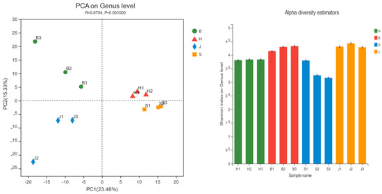 Alpha Shannon index diagram/PCA analysis diagram. (H represents the Hechuan District, S represents the Shapingba District, J represents the Jiangbei District, and B represents the Beibei District).