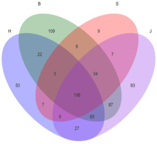 Analysis of the bacterial colony structure at the genus level of the four groups. (H represents the Hechuan District, S represents the Shapingba District, J represents the Jiangbei District, and B represents the Beibei District).
