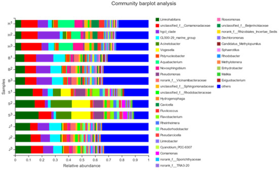 Through a bar chart analysis, it could be seen that the measured water samples had a significantly high bacterial diversity. Figure 4 showed the bar map at the phylum level. The community composition structure of the Beibei District and Jiangbei District was relatively similar. The higher relative abundance in the Hechuan District were unclassified-f-Comamonadaceae [32], unclassified-f-Rhodobacteraceae [33], and the Hgcl_clade [34]. The dominant flora was the Hgcl_clade, and its abundance in the three samples in this group was 12.35, 12.25, and 15.28%, respectively. The relatively high relative abundance levels in the Beibei District were unclassified_f_Comamonadaceae, the Hgcl_clade, and Acinetobacter. The dominant flora was Hgcl-clade, whose abundances in the three samples were 12.98, 10.78, and 11.57%, respectively. In the Shapingba District, the relative abundances form Limnohabitans, Acinetobacter, and Vogesella. The dominant flora was Limnohabitans, whose abundances in the three samples were 13.17, 14.65, and 17.51%, respectively. The most abundant species in the Jiangbei area were Limnohabitans, unclassified-f-Comamonadaceae, and the CL500-29-marine-group. The dominant flora was Limnohabitans, whose abundances in the three samples were 11.18, 11.56, and 11.81%, respectively.