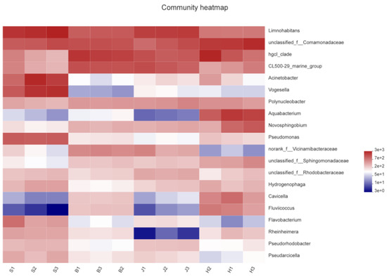 The heatmap displayed the species composition information of the community by reflecting the number of species through a color ladder. As can be seen in Figure 5, the community composition of the three samples collected from the Jiangbei District and the Beibei District was relatively uniform; one of the three samples collected from the Hechuan District and the Shapingba District had a few differences. The community composition of Hechuan and Beibei was the most similar. Limnohabitans [35], comamonadaceae, hgcl_clade, and CL500-29-marine-group had a higher abundance in the four samples; in the Shapingba Distric, it also contained high levels of Acinetobacter and Vogesella, and Hechuan District also contains high levels of Aquabacterium. Bacilli are the predominant flora in urban river water and sediments, which are associated with the gut flora of many mammals and humans, and are effective fecal surrogate indicators. The higher abundance of bacilli in the downstream may be due to the high concentrations of nitrate, ammonia, feces, etc. in medical waste liquid and domestic wastewater [36]. The results of this study showed that the concentration of pollutants gradually increased along the flow direction of the river due to the discharge of domestic and industrial wastewater, which seriously affected the abundance changes of the bacterial community in the river.