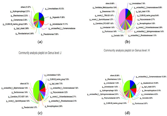 Figure 6a reflects the species composition of the Beibei District, which can clearly reflect that unclassified_f_Comamonadaceae, Hgcl_clade, and the CL500-29 marine group were the dominant species in the Beibei District with a relatively high relative abundance that accounted for the total community of 28.8%. Figure 6b reflects the species composition of the Shapingba District, which clearly reflects that Limnohabitans, Vogesella, and Acinetobacter were the dominant species in the Shapingba District. The relative abundance of Limnohabitans was relatively high, accounting for 15.12% of the total community. Figure 6c reflects the species composition of the Jiangbei District, which clearly reflects that Limnohabitans, unclassified_f_Comamonadaceae, and the CL500-29 marine group were the dominant species in the Jiangbei District. The relative abundance of Limnohabitans was high, accounting for 11.52% of the total community. Figure 6d reflects the species composition of Hechuan District, which clearly reflect that unclassified_f_Comamonadaceae, the Hgcl_clade, and the CL500-29 marine group were the dominant species in the Hechuan District. The relative abundance of unclassified_f_Comamonadaceae was high, accounting for 13.30% of the total community. Combining Venn diagrams, community Bar diagrams, Heatmap diagrams of community composition, and pie diagram test results can help us explore the species composition of the communities at the four sampling points, including the number of species and species abundance, by comparing samples or groups. The differences in species composition can reflect the composition information between them more clearly, and provide detailed parameters for monitoring and judging the pollution of the entire Jialing River.